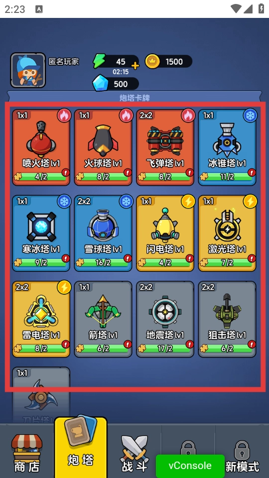 4、点击【炮塔】按钮,进入炮塔卡牌界面,在这里能够查看并使用喷火塔、火球塔等多种炮塔卡牌,进行防御布置。