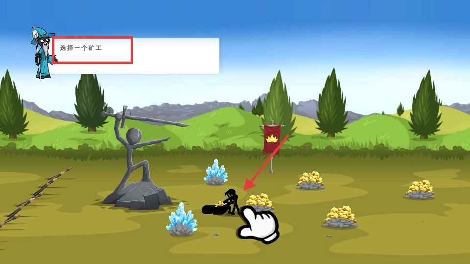 2、选择矿工开采金矿,积累黄金资源,为训练士兵、应战敌人奠定基础。