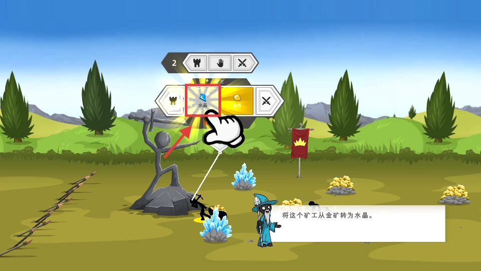 3、将矿工采矿类型切换为【水晶】,开采水晶资源,丰富储备以支持兵种训练。