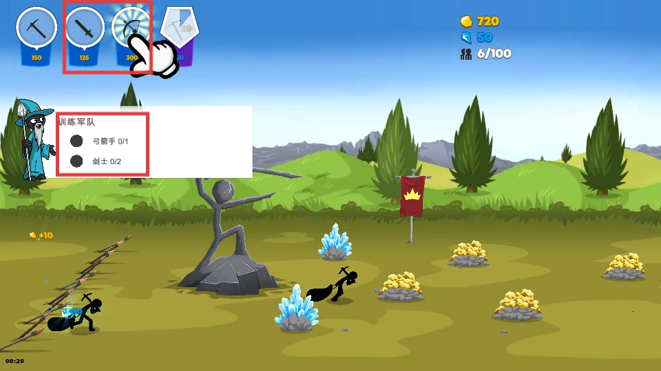 4、依据资源训练【弓箭手】与【剑士】,提升部队战力,为摧毁敌雕像、夺领土准备。