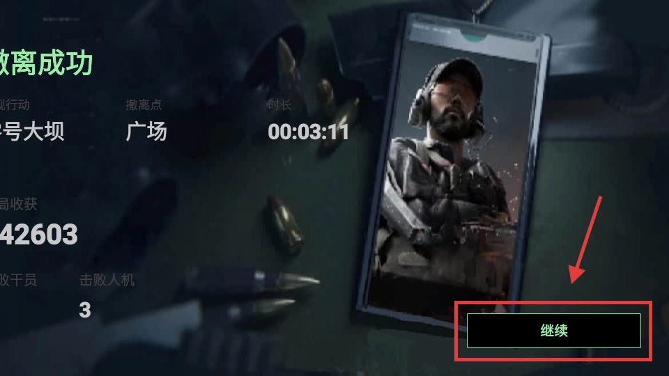 4、撤离成功后点击【继续】按钮,即可进入下一局游戏或结算界面,通过积累资源解锁更多游戏内容。