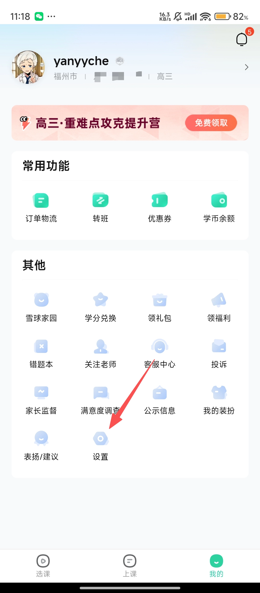 2、在一课的【我的】页面,我们找到【设置】选项并点击,进入设置界面呀。