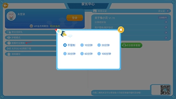 打开兔小贝乐园后,需使用手机号、微信或QQ登录账号(游客模式下无法进行会员购买操作)。