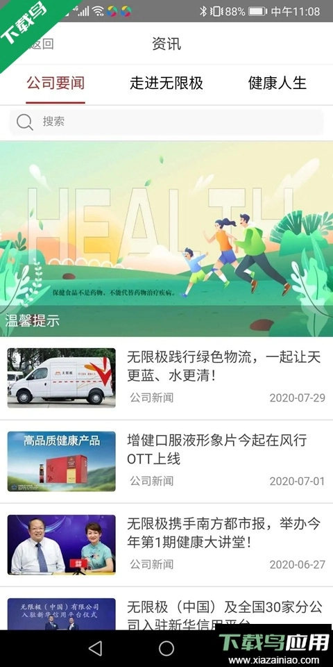 在资讯板块,您能够浏览公司要闻、品牌故事以及健康知识等内容,只需切换不同栏目就能查看详细信息。