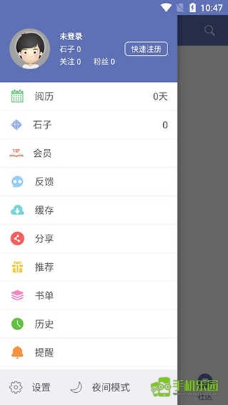 软件的侧边功能包含缓存、书单、历史记录等多种实用功能。