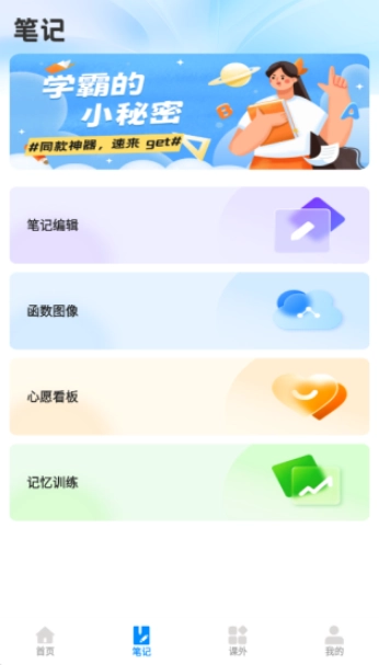 在笔记页面中,你可以进行笔记编辑、函数图像绘制、心愿看板设置、记忆训练等操作。