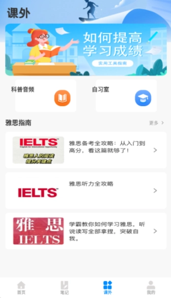 课外页面整合了科普音频、自习室等实用功能,同时也包含雅思指南相关信息。