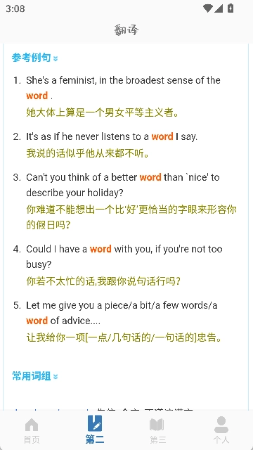 翻译结果附带详细解析,包括词汇用法说明和实际例句