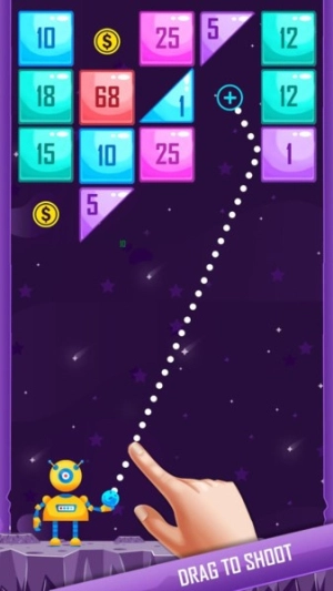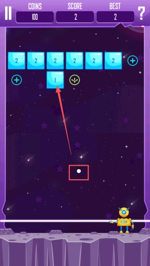 调整角度对准方块,发射小球借助反弹机制击碎更多目标,收集掉落的小球来增加可发射的数量。