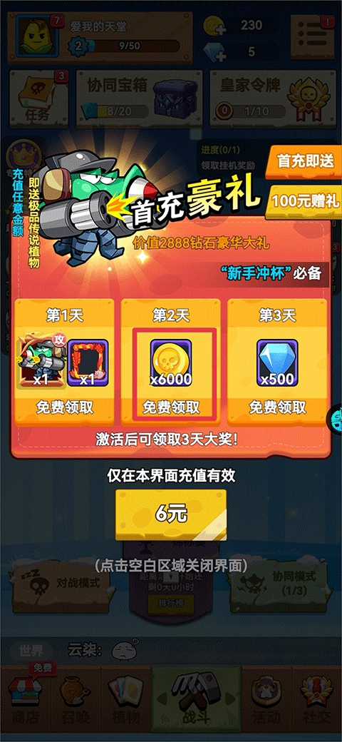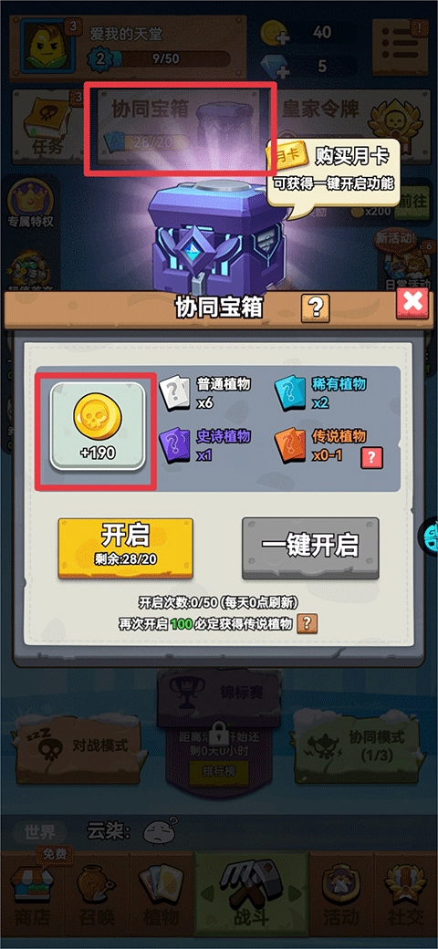 2、开启合作宝箱有机会获得植物角色和金币奖励