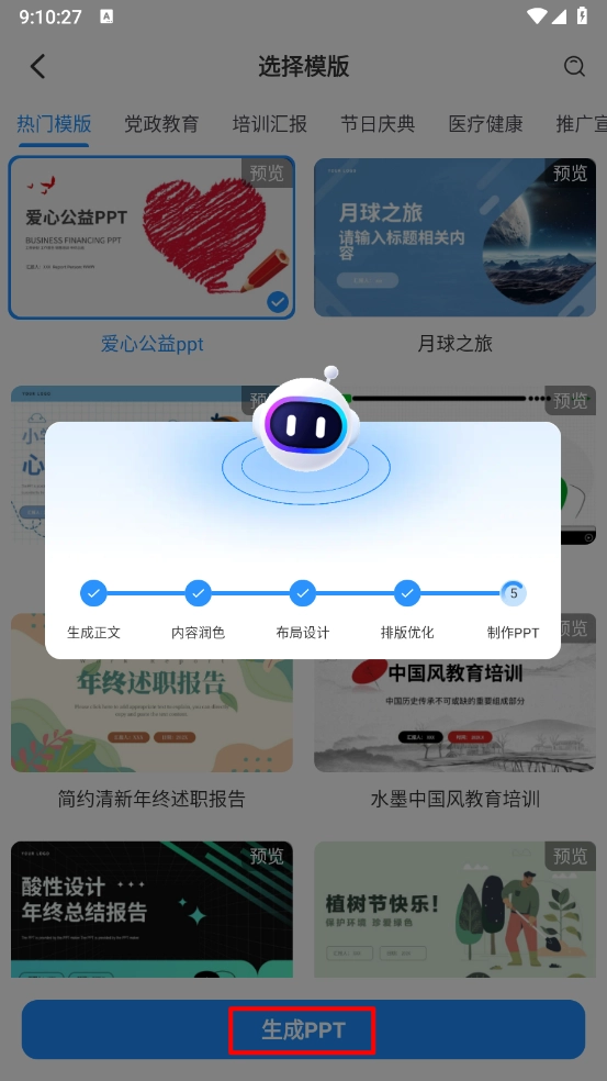 在模板库中滑动浏览,挑选契合主题风格的模板,系统会自动应用该模板并生成对应的PPT。