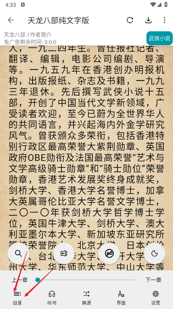 在阅读界面点击中间区域呼出菜单,点击"目录"。