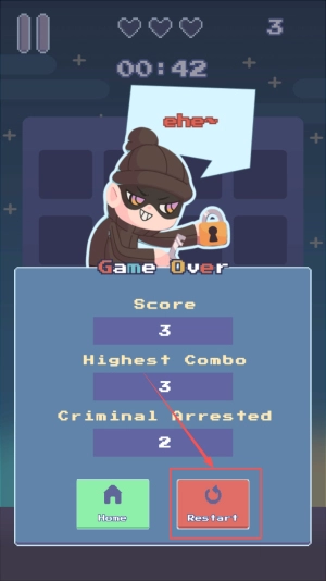 查看成绩的方式如下:游戏结束时的画面会呈现“Score”(分数)和“Highest Combo”(最高连击数)这两项信息,若想再次尝试挑战,点击“Restart”按钮即可重新开始游戏。