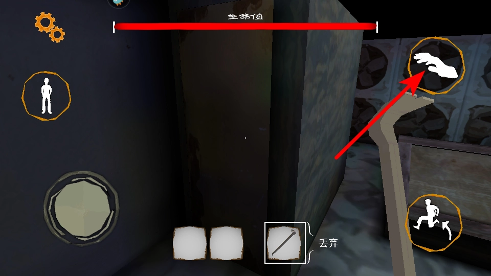 在场景里找到撬棍后,点击红色箭头所指的拾取按钮,将其放入道具栏,这是收集道具的关键步骤。