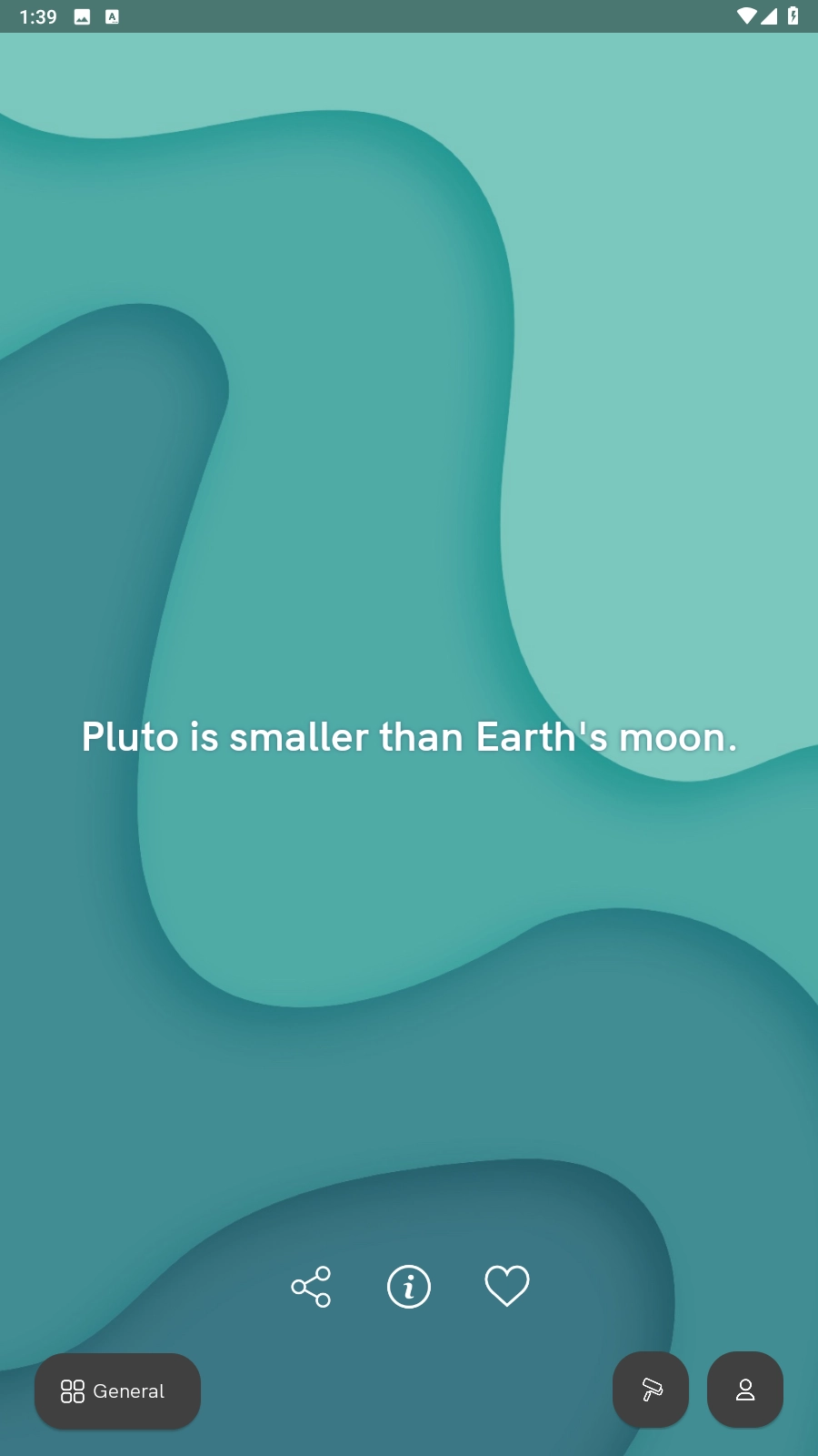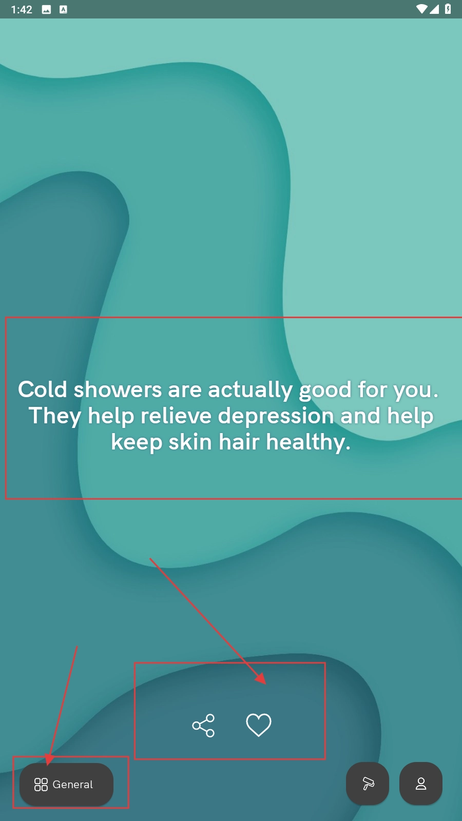在应用界面里阅读英文内容时,你可以点击分享图标来分享内容,点击爱心图标进行收藏,要是想切换分类的话,点击【General】就行。