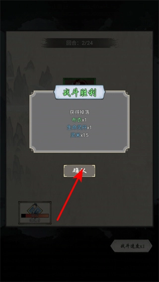 战斗获胜后,点击确认按钮就能领取本次战斗的掉落奖励,像布衣、生命灵丹这类物品,这是积累修仙资源的基础操作,能为后续修士的培养和宗门的发展提供助力。