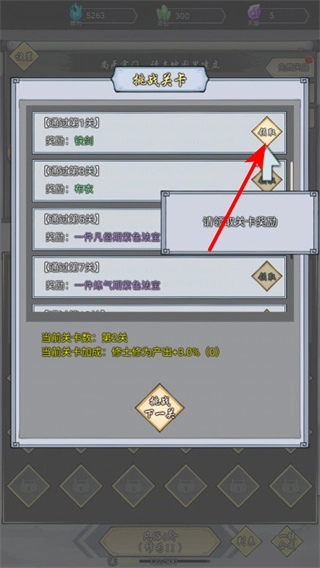 在挑战关卡的界面里,点击领取按钮就能拿到已通关关卡对应的奖励,像铁剑、布衣这类物品。解锁这些奖励后,修士的装备水平会得到提升,战斗能力也能随之增强。