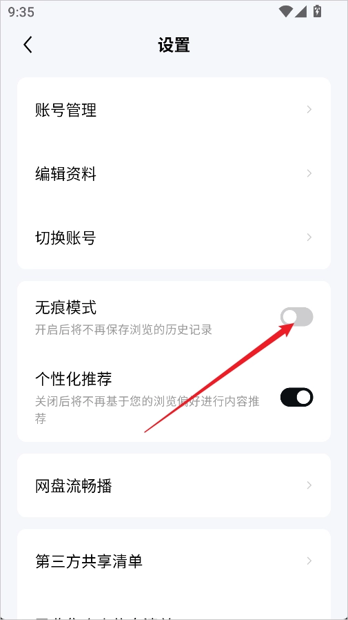 3、在设置列表中找到【无痕浏览】,将开关打开即可生效。