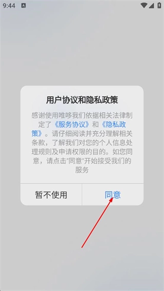 1、阅读服务协议和隐私政策后,点击同意,进入唯哆登录页面。