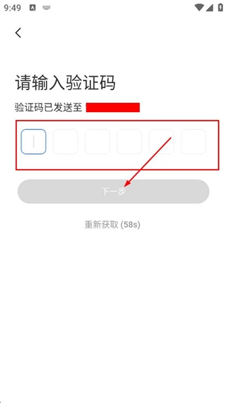 4、在请输入验证码页面,填写收到的验证码,点击下一步按钮,完成注册流程。