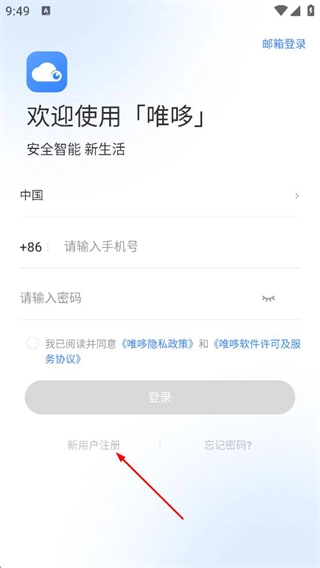 2、在唯哆登录页面,点击新用户注册选项,进入手机号注册页面。