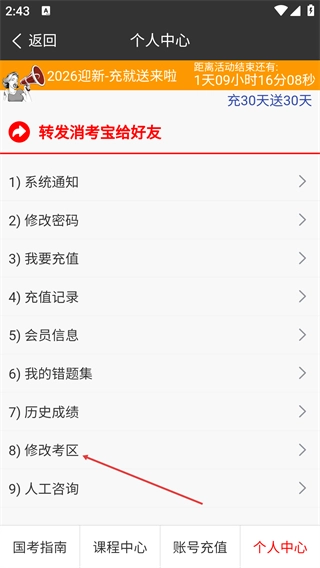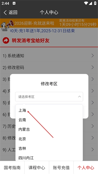 2、在个人中心界面,选择【修改考区】选项,弹出修改考区的操作窗口。