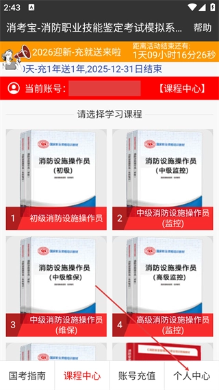 1、进入课程中心页面后,点击底部导航栏中的【个人中心】选项。
