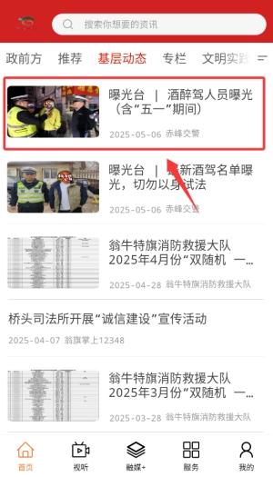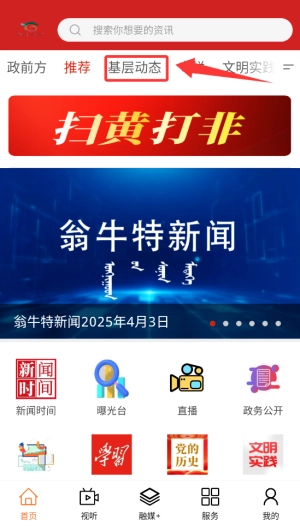 打开活力翁牛特后,在首页的导航栏里找到“基层动态”这个入口,点击它就能进入本地社区新闻的聚合页面了。