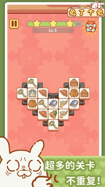 角色养成系统:设计六只风格各异的宠物兔,每只都配备专属技能冷却条。收集胡萝卜道具能够提升角色等级,达到满级后可解锁特殊消除特效与成就勋章。