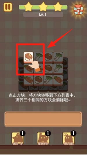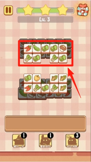 游戏界面下方设有7个槽位,玩家将3个相同的方块放入槽位即可触发消除效果。若要使用下一层的方块,需先将其上方一层的方块放入槽位才行。