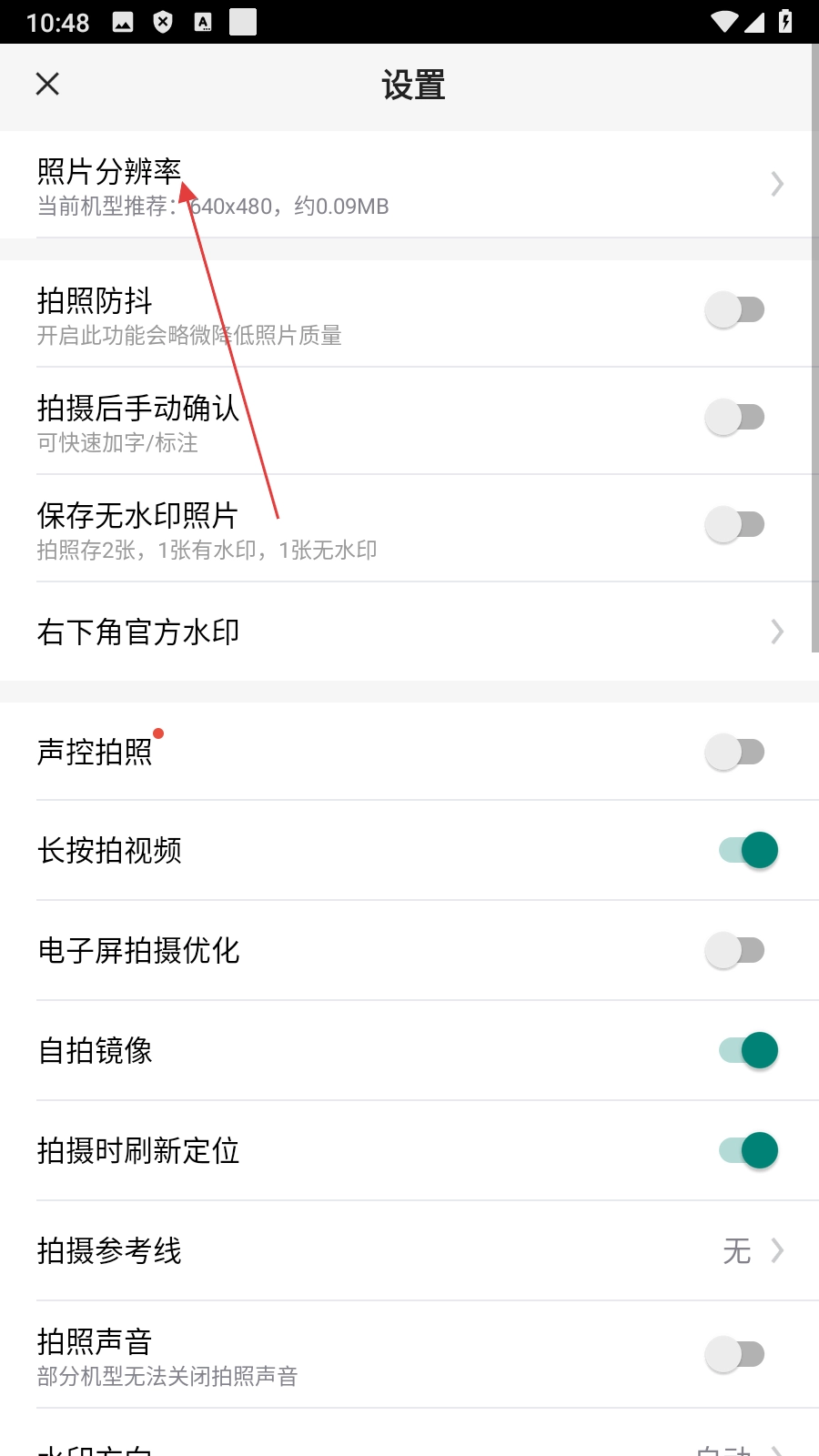3、在设置页面,点击【照片分辨率】,进入照片分辨率选择页面。