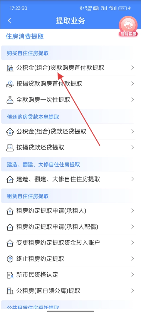 2、这里提供了多种提取方式,大家可根据自身需求选择,下面以【公积金(组合)贷款购房首付款提取】为例进行说明