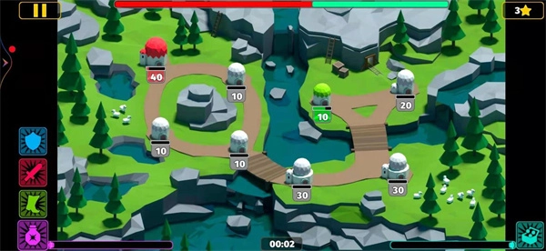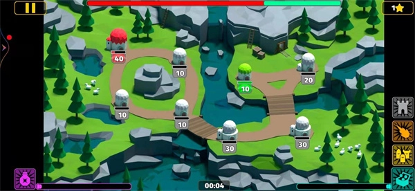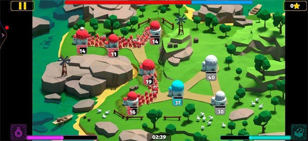 游戏开局时,你会持有一座或多座屯聚兵力的堡垒,目标是夺取那些尚未被开拓的堡垒,逐步囤积士兵,凭借谋略与智慧歼灭其他敌方士兵,从而赢得战局胜利。首先点击我方拥有兵力的堡垒(我方堡垒以红色标识),接着点击未被占领的堡垒(未被占领的堡垒以白色标识),即可指挥士兵展开攻陷行动,争夺成功后,该堡垒将转变为红色。当兵力积累至合适数量时,便可开展下一步的讨伐攻占。待敌方的兵力与城堡全部被我方攻陷,战斗便宣告胜利。