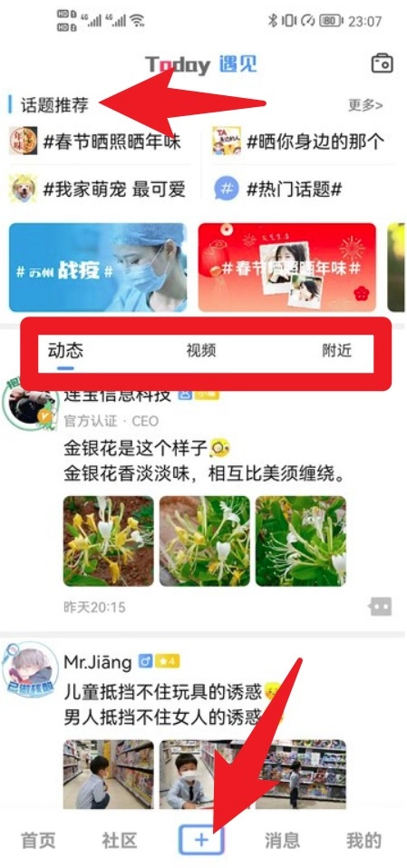 切换到圈子页面,就能浏览本地用户分享的动态、视频以及周边生活资讯,点击页面下方的+图标,即可快速发布帖子参与互动。