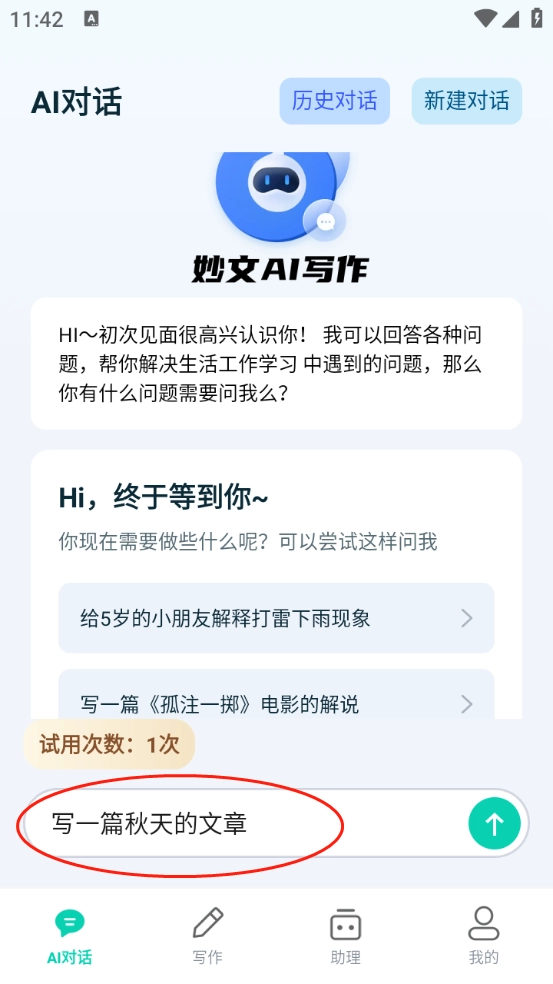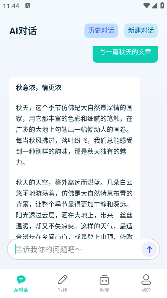 挑选自己所需的功能打开,我选的是AI对话板块,输入了“写一篇关于秋天的文章”。