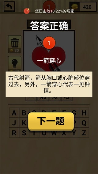 《我爱猜成语》是一款以猜成语为核心的解谜闯关休闲益智游戏。游戏里,玩家能够自主挑选不同的挑战模式来参与关卡,比如看图猜词、释义选择、填空补全等多种形式。同时,游戏还为玩家配备了详尽的成语解析内容,涵盖典故、出处等方面的详细说明,助力玩家在游戏过程中积累文化知识。这款游戏玩法简便,并且设计了丰富多样的关卡,玩家可以逐个攻克,不断挑战自我。