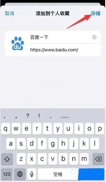 3、在添加到个人收藏页面时,输入要收藏网页的名称,接着点击【存储】按钮即可完成操作。