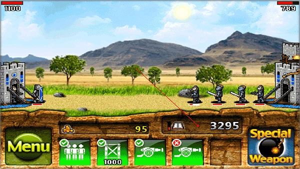 2、选择下方的单位生成按钮,召唤士兵参与战斗。通过消灭敌人积累资源,强化自身实力。