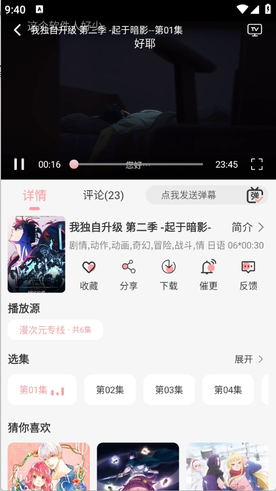 用户打开自己喜欢的动漫后,能够挑选集数、选择播放源,还可以发送弹幕。