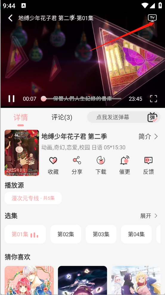打开你想看的动漫资源进入播放页面后,点击右上角的“TV”按钮。