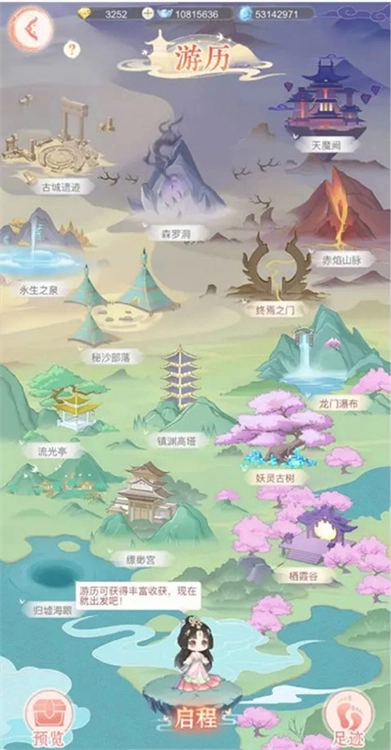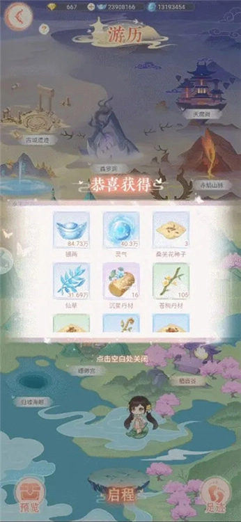 仙主大人们只要通关剧情1-9,就能开启游历玩法啦。进入【仙门】界面后点击“游历”,就能看到所有可以去游历的地方,而且随着仙主大人主线剧情的推进,还会陆续解锁新的游历地图哦。在游历界面点击“启程”,就会随机前往已经解锁的不同地点进行游历,每次游历最多持续8小时,仙主大人们可以通过点击“足迹”查看已经收集到的材料。每个游历地点产出的资源都不一样,有银两、灵气、仙草,还有一定概率能得到各类珍稀物品,每个地点游历满10分钟就能100%获得必得奖励,如果游历时间没满10分钟的话,就没办法拿到奖励哟。