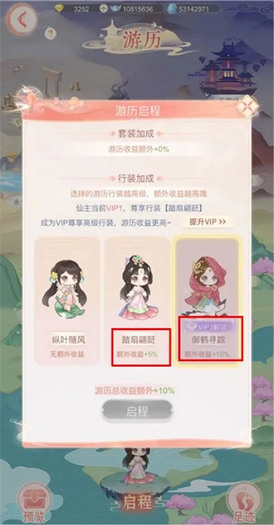 仙主大人选好游历行装后,就能开启游历之旅啦。行装品质越高,游历所得的奖励也会更丰厚哦~ 要是达到VIP1,就能解锁行装【踏扇翩跹】的额外收益加成5%;达到VIP3的话,行装【御鹤寻踪】的额外收益更是能加10%呢!小助手建议仙主大人优先解锁VIP权益,再挑选当前最顶级的行装去游历,这样能拿到的收益可是最大化的哟!