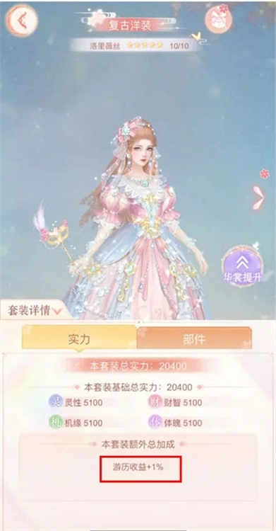 特定的套装还能增加游历收益呢!那哪些套装能够提升游历加成呀?据了解,当前能提升加成的套装仅有一套:复古洋装-洛里薇丝。这套衣服能在游历行装的基础收益加成之上,再额外获得1%的收益加成,仙主大人要是对这套套装进行注灵或者升阶,额外收益的加成也会跟着不断提高哦!