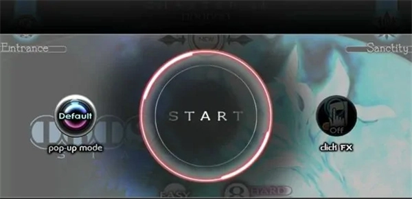 当玩家在曲目界面点击后,会进入游戏准备界面。点击中间的START键(蓝色圆圈,若为隐藏曲目则显示红色圆圈)即可开始游戏。开始键的左侧是pop-upmode设定按钮,右侧是clickfx设定按钮。