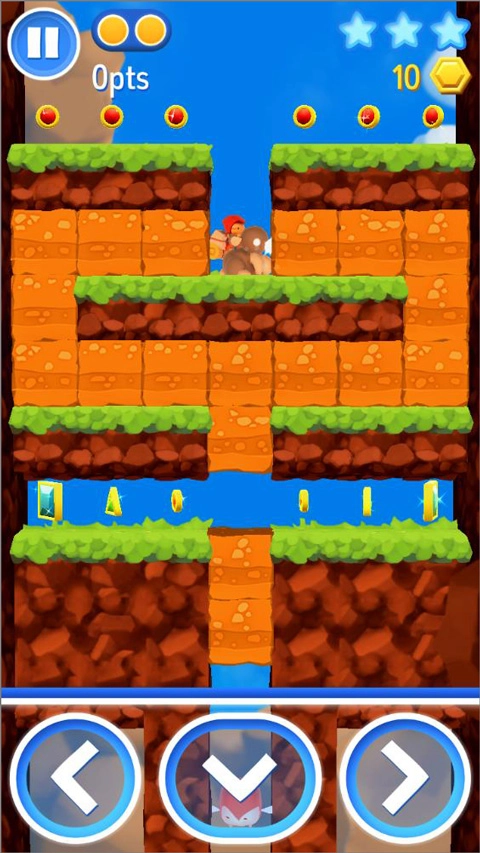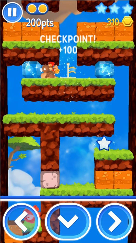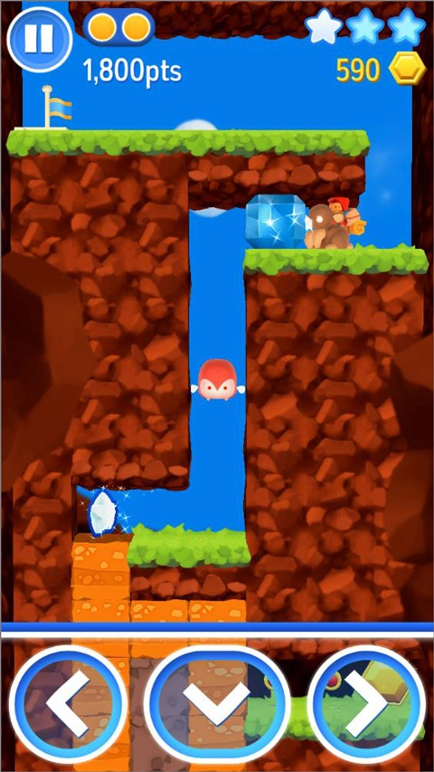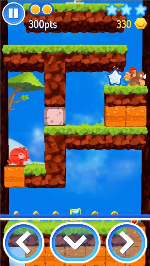 接下来要收集第一颗星星,不过得先把拦路的怪物解决掉才行。拿到彩色花朵的增益效果后就全力冲刺!然后赶紧挖掘石块,把第二颗星星拿到手。到了底部,先拿炸弹炸开冰块,推动三块石头后进去拿到钥匙,再下到最底层打开宝箱。
