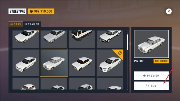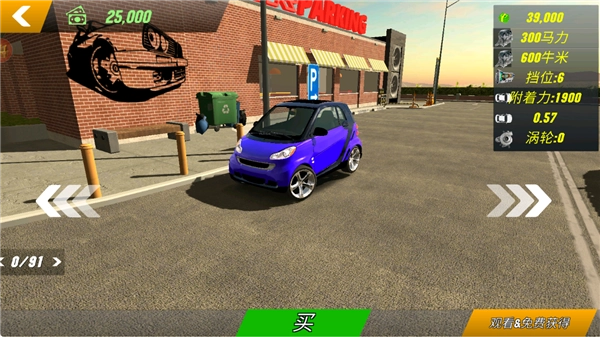 首先从主界面进入车库,这里陈列着多款可供选择的汽车,未解锁的车型需要我们进行购买。