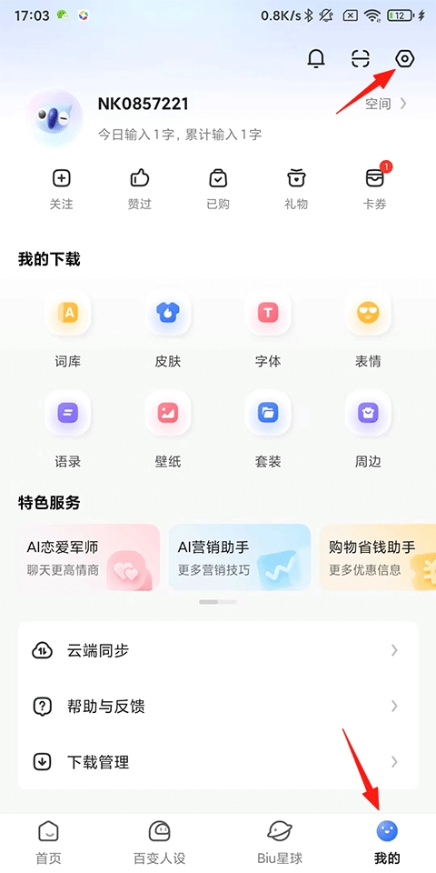 1、打开讯飞输入法,点击我的-右上角设置按钮;
