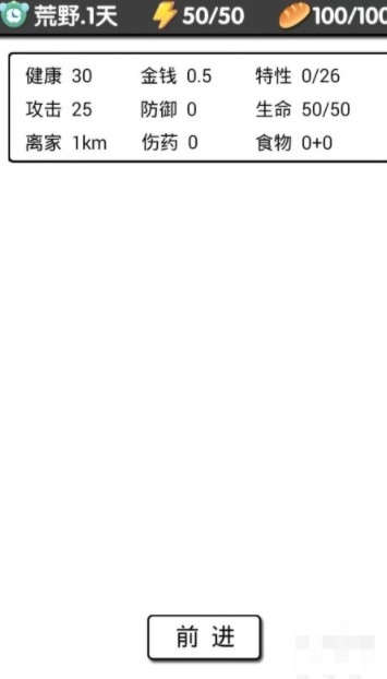 4、选择愣头青,就正式开始游戏了,,点击前进,前进和探索都会消耗精力,精力可以通过睡觉和喝啤酒来回复(啤酒等你到了县城就会有了)