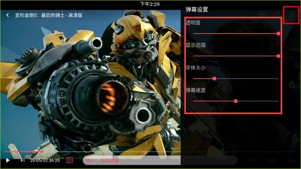 5、播放界面右上角的“更多”选项中,用户可以调整透明度、字体大小以及弹幕速度等个性化设置。