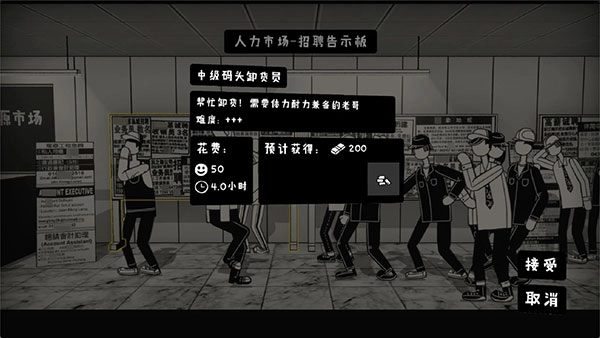 玩家得去游戏里的人力市场接各种打工小游戏来做。这些打工小游戏在耗时长短、难度高低和报酬多少上都有差异,因此玩家得好好挑选一番才行。要是去得太晚,人力市场里那些不错的日结工作可就没啦。